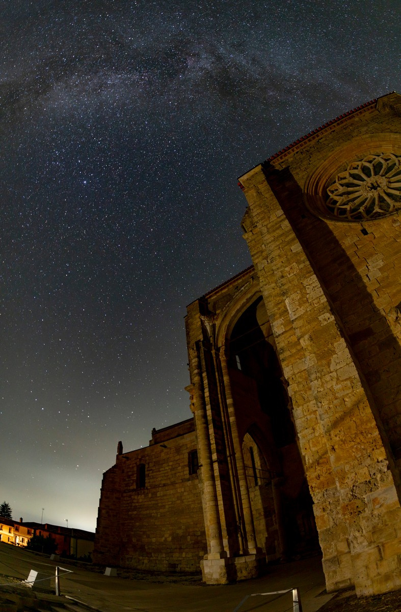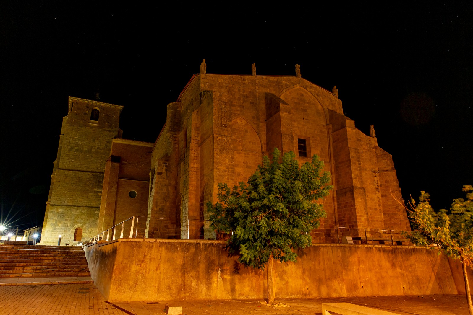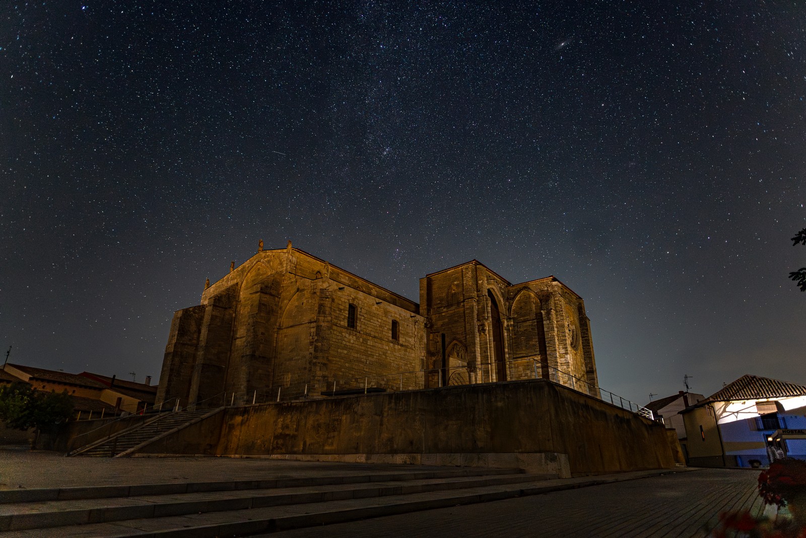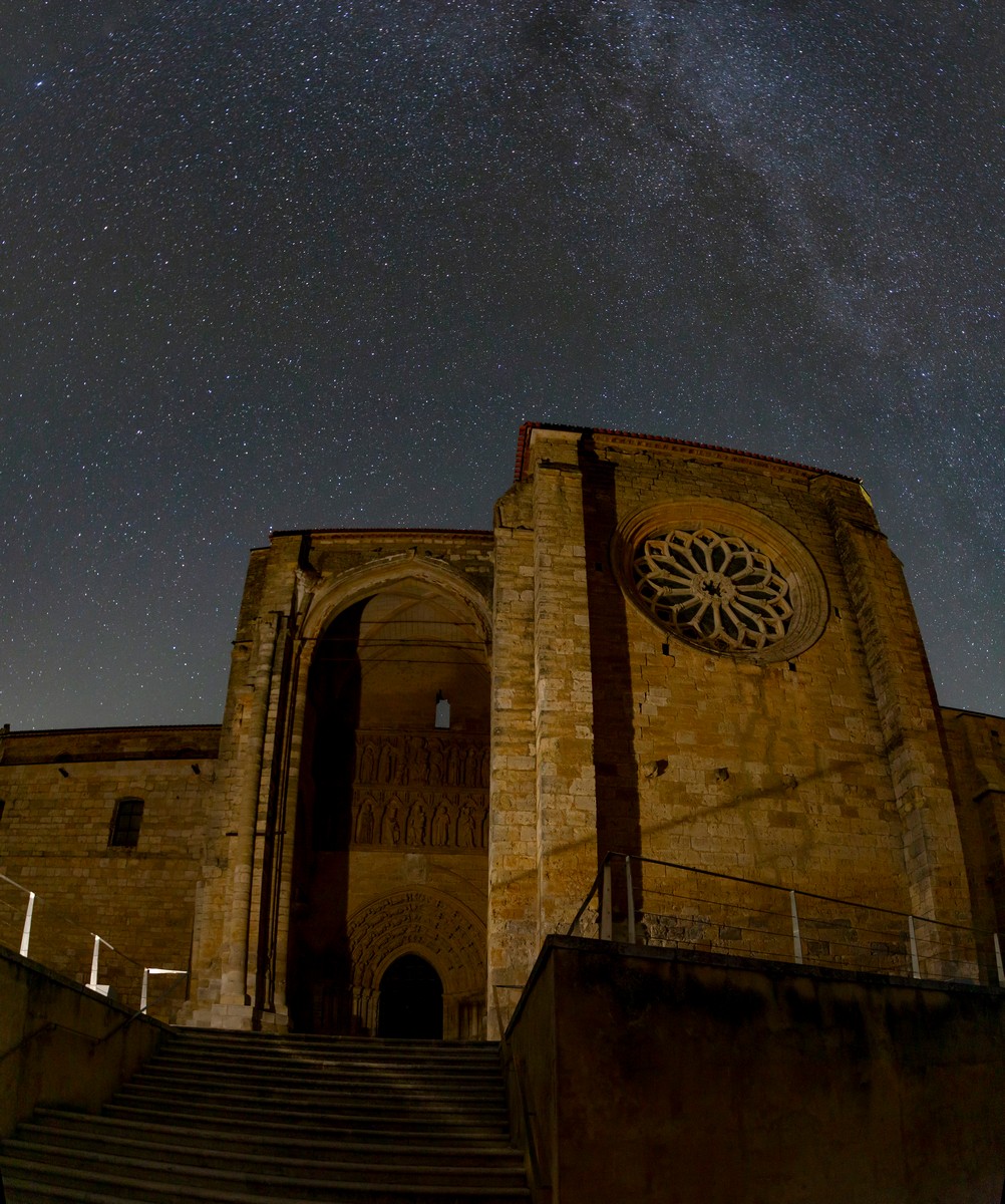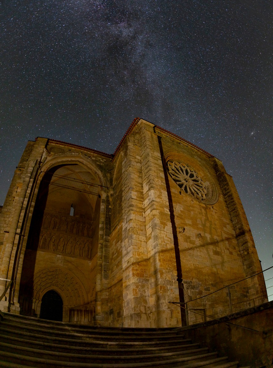 La monumental Iglesia de Santa María la Blanca, vinculada a la Orden del Temple, se alza majestuosa bajo un cielo que realza su grandeza.